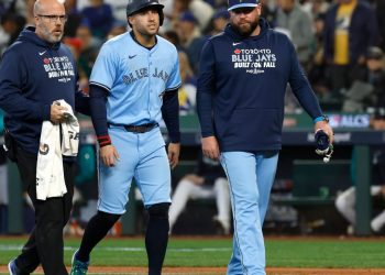 George Springer exits Blue Jays’ Game 5 loss after hitting knee with pitch