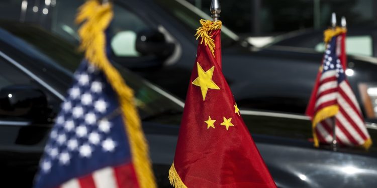 The national flags of the United States and China adorn motorcades in Beijing, China.