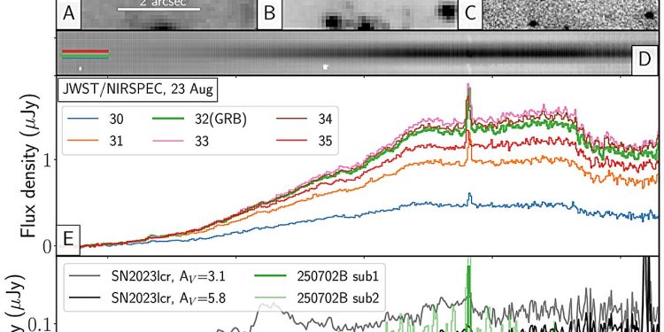 Benjamin P. Gompertz et al, JWST spectroscopy of GRB 250702B: an extremely rare and exceptionally energetic explosion in a dusty and massive galaxy at z = 1.036, arXiv (2025). DOI: 10.48550/arxiv.2509.22778