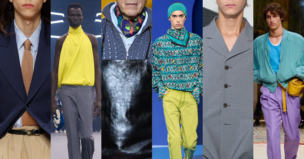 These are the colors that made it a show that deserves to be recalled. In a moment of maximum beige and Greige, Mr. Vitale splashed in a cartoon plot, with lavender denim and his shirts in yellow and mint green yellow. All very disco-meets-art-deco. A rotation of striped jeans was like portable circus tents. The real star was the outfit of a drop shoulder bomber, pleated pants and almond -shaped moccasins. It was a relaxed silhouette that we saw several times, but in the hands of Mr. Vitale, the bomber was Sarcelle, the purple pants and the shirt under corn blue. In these colors of Dick Tracy, the outfit was revolutionary.