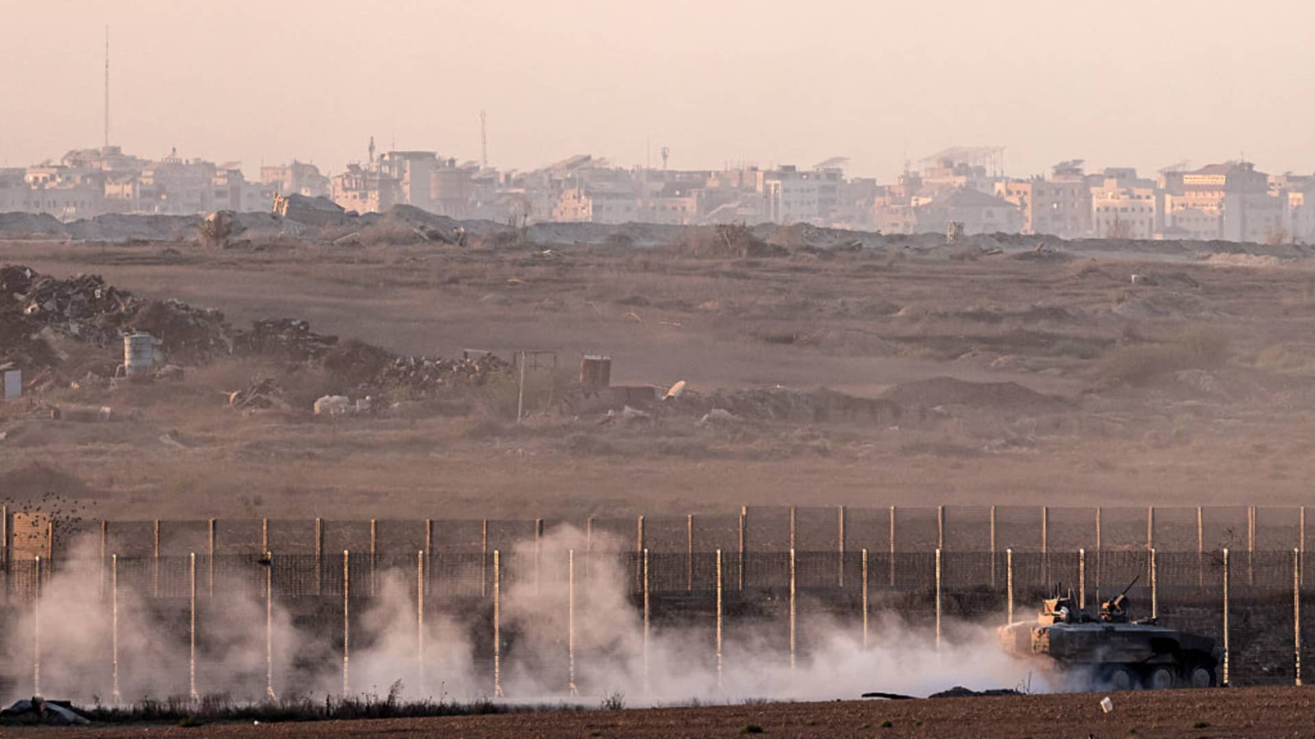 This photo taken from a position on the Israeli border with the Gaza Strip shows an Israeli armored personnel carrier driving along the separation barrier on August 20, 2025.