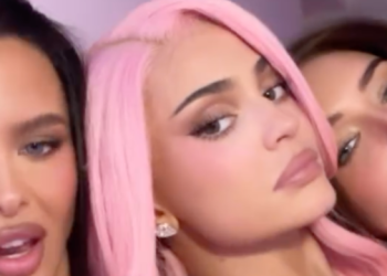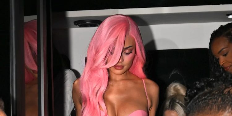 For the occasion, she also went back in time by pulling out a long cotton candy pink wig (with a side parting of course). To match, she donned a floor-length latex dress in the same shiny shade, designed with thin spaghetti straps and a neckline with bra cups. On her feet, pointed lace heels completed the look. Beside him, his daughter Stormi looked like the ultimate “mini me,” wearing a color-coordinated jacket and skirt with a merch t-shirt featuring a photo of King Kylie.