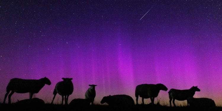 Sheep under shimmering Northern Lights (Aurora Borealis) on the North Sea dike near Hagermarsch (Lower Saxony) in East Frisia on 13.08.2024. (Photo by Matthias Balk/photo alliance via Getty Images)