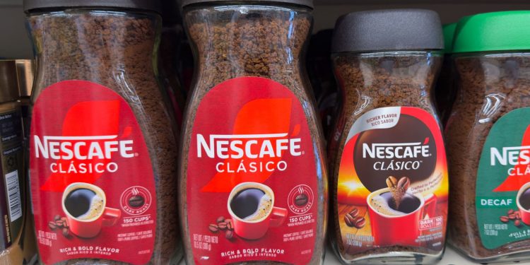 Pots of Nescafé instant coffee, part of food giant Nestlé’s portfolio, sit on a supermarket shelf in Encinitas, California, United States, September 2, 2025.