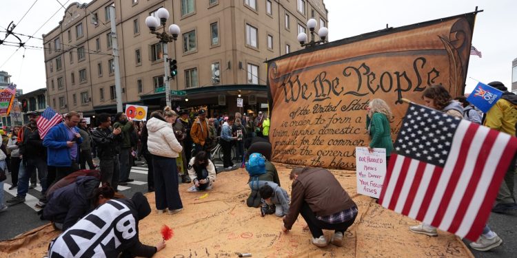 Trump’s Republican Party denigrated the protests “Hate America” ralliesbut in many places the events were more like a street party. There were marching bands, huge banners with the preamble to the US Constitution “We The People” that people could sign, and protesters wearing inflatable costumes, particularly frogs, which became a sign of resistance in Portland, Oregon.