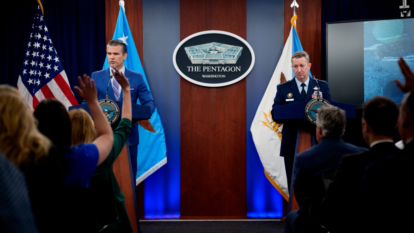 U.S. Secretary of Defense Pete Hegseth (left), accompanied by Chairman of the Joint Chiefs of Staff Gen. Dan Caine, speaks at a Pentagon news conference in June in Arlington, Virginia.