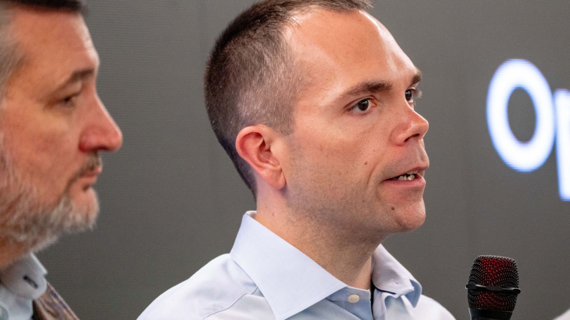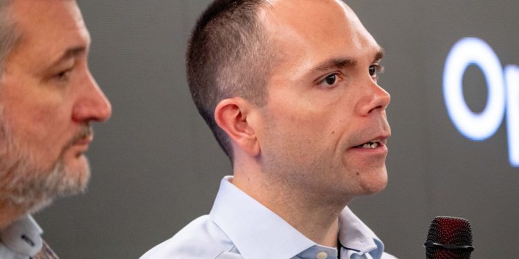 Oracle CEO Clay Magouyrk, center, speaks during a media tour of the Stargate data center in Abilene, Texas, September 23, 2025. Stargate is a collaboration of OpenAI, Oracle and SoftBank, with promotional support from President Donald Trump, to build data centers and other artificial intelligence infrastructure across the United States.