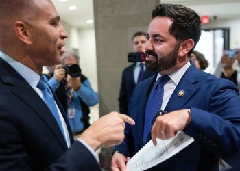 Rep. Mike Lawler (R), R-N.Y., confronts House Minority Leader Hakeem Jeffries, D-N.Y., about his signing on to a bill that ...