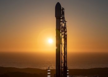 File: A SpaceX Falcon 9 rocket is in the launch position at the Space Launch Complex 4 East (SLC-4E) from ...