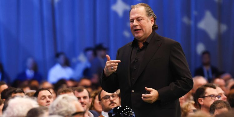 Salesforce CEO Marc Benioff delivers the keynote address at the start of the Dreamforce conference at the Moscone Center in San Francisco, Calif., Tuesday, Oct. 14, 2025.