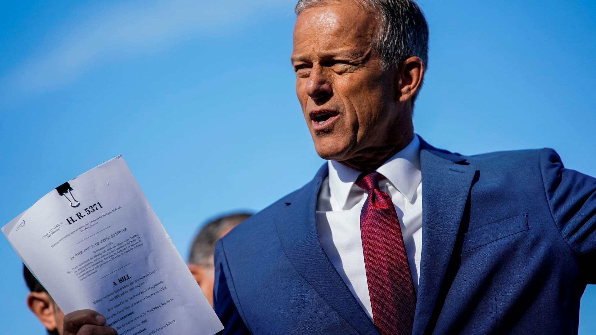 U.S. Senate Majority Leader John Thune (R-SD) holds a copy of the Continuing Appropriations and Extensions Act as he speaks during a press conference, accompanied by House Speaker Mike Johnson (R-LA) and other Republican colleagues, on the first day of a partial government shutdown, at the U.S. Capitol, in Washington, DC, U.S., October 1 2025.