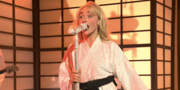 Carpenter served as both the host and musical guest of the show, and the “Nobody’s Song” performance, featuring a martial arts stage setup, took place near the end of the show. Earlier in the evening, she sang “Manchild” as her first musical number.