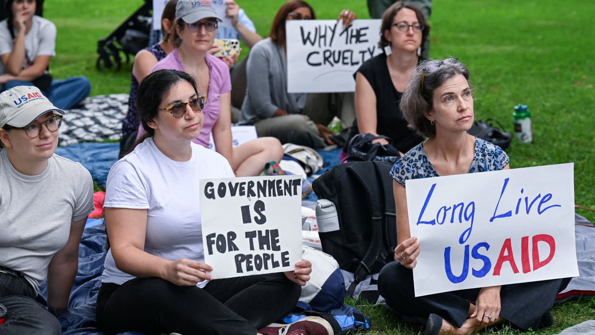 Protesters hold up posters the day Senator Chris Van Hollen (D-MD) and Representative Ayanna Pressley (D-MA) address laid-off federal workers…