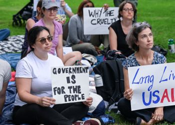Protesters hold up posters the day Senator Chris Van Hollen (D-MD) and Representative Ayanna Pressley (D-MA) address laid-off federal workers ...