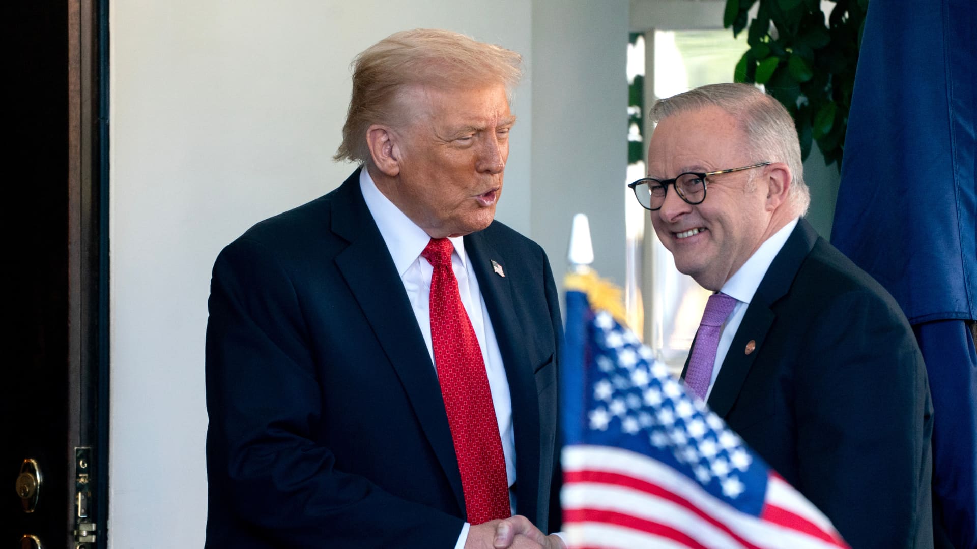 U.S. President Donald Trump and Australian Prime Minister Anthony Albanese shake hands outside the West Wing of the White House…