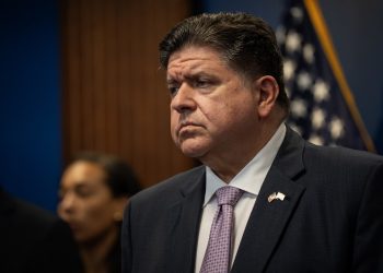 Illinois Governor JB Pritzker stands with other elected officials to discuss federal deployments in Chicago, September 29, 2025. E. Jason ...