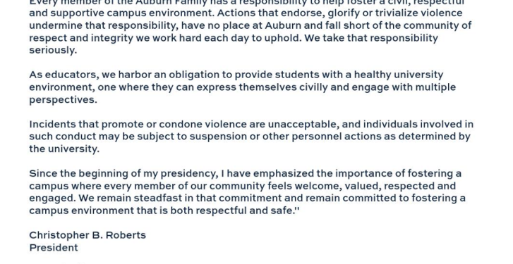 Auburn University President Christopher Roberts, who is named in one of the lawsuits, posted a statement on Facebook in September announcing the firing of employees over such posts for violating the university’s code of conduct.