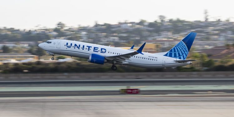 A United Airlines Boeing 737-MAX 8 takes off from San Diego International Airport en route to New York on August 24, 2024.