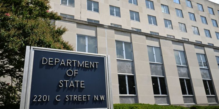 A general view of a U.S. Department of State sign outside the U.S. State Department building in Washington, DC, United States, July 11, 2025.