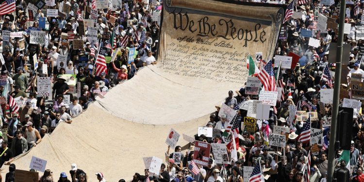 Protesters hold a banner depicting the preamble to the US Constitution in downtown Los Angeles during an anti-Trump No Kings Day demonstration on June 14.
